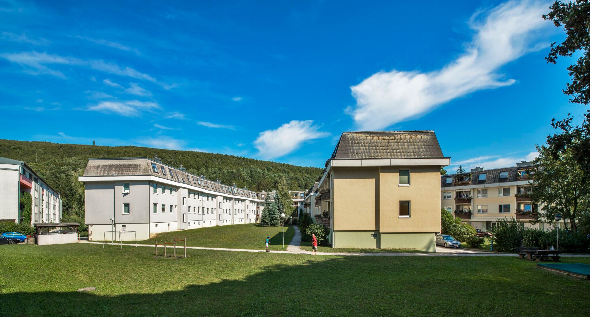 Die Wohnhausanlage in der Speichberggasse im Westen Purkersdorfs, errichtet 1987, kann mit Gewissheit als Beginn einer neuen Architekturära in der Wohnbauvereinigung bezeichnet werden. Die 137 Wohnungen sind nicht, wie bis dahin üblich, in pragmatischen Würfeln und Quadern untergebracht, sondern folgen einem schönen städtebaulichen Konzept, das sich aus Grundstücksform und Topografie entwickelt. Architekt Rudolf Jarosch gruppierte mehrere längliche Baukörper um einen dreieckigen Innenhof, in dem sich Parkbänke, Spielplatz und Trauerweide befinden, und legte über die gesamte Anlage eine raffinierte Mischung aus Urlaubsflair und Industrial Chic.