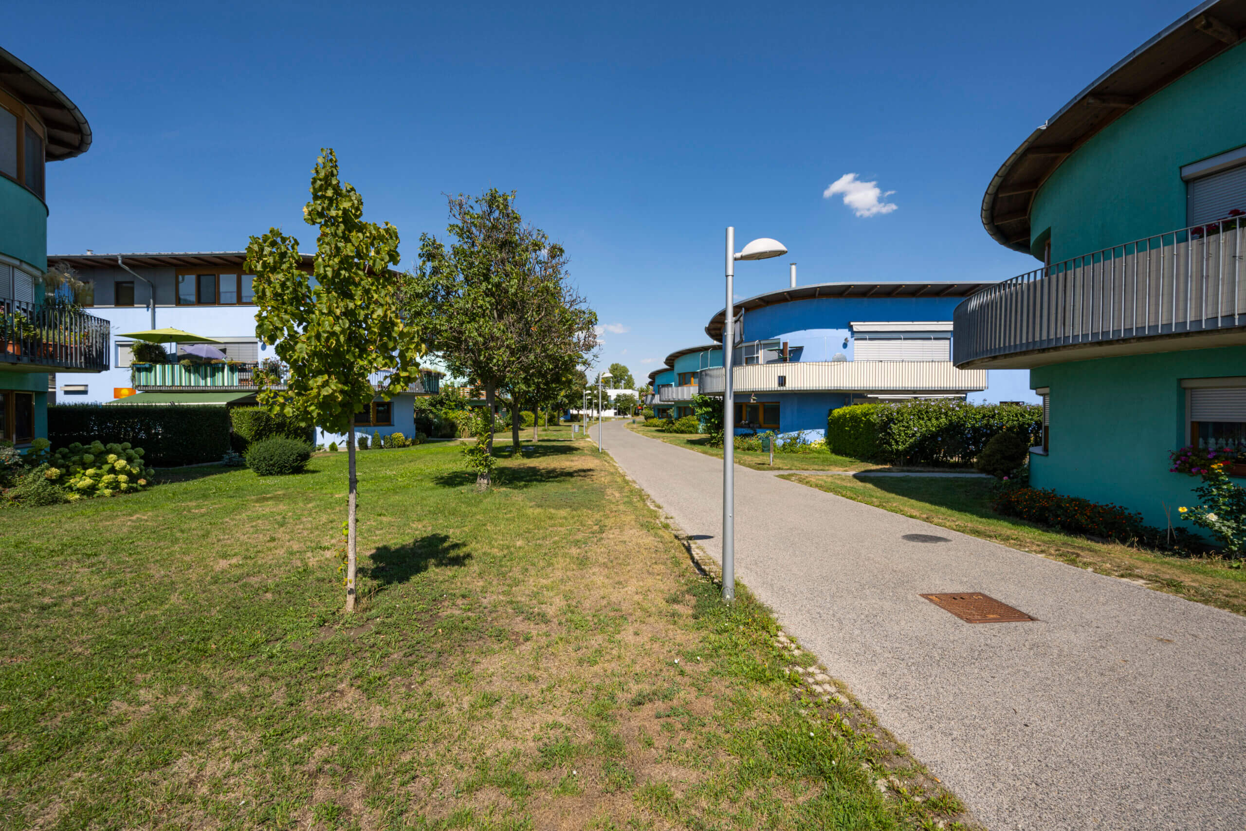 Die Süßenbrunnerstraße 60 liegt direkt beim Badeteich und den Blumengärten Hirschstetten im 22. Wiener Gemeindebezirk. Die Anlage umfasst 176 Wohnungen. Aufgrund der niedrigen Bauweise konnte in der gesamten Anlage auf Lifte verzichtet werden. Erschlossen werden die 176 Wohnungen über Freiluft Stiegenhäuser, Laubengänge und Brücken. Und das Konzept wird bis ins kleinste Detail konsequent weitergedacht: Der an die Wohnhausanlage anschließende Kindergarten orientiert sich an dem von Franz Schuster in den zwanziger Jahren entwickelten Pavillonkindergarten, auch »Schustertyp« genannt, bei dem der Ausblick und die Einbettung in die Natur im Vordergrund stehen.